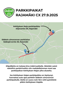 Kilpailukeskus (pukuhuoneet, kisatoimisto ja kisareitti) sijaitsee Kehityksen Majalla osoitteessa Kiljavantie 231, 005200 Rajamäki.